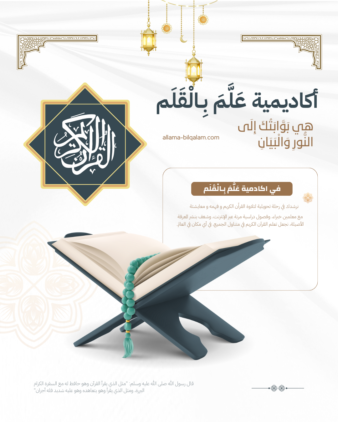 من نور القرآن الكريم، تبدأ رحلتنا. في مَنَصَّةُ عَلَّمَ بِـالْقَلَمِ، نحن نؤمن بأن العلم يبدأ بالقلم، ولهذا نسعى لتقديم تجربة تعليمية فريدة تجمع بين أصالة المنهج القرآني وأحدث تقنيات التعليم عن بعد، لتصل المعرفة إلى كل الطلاب، أينما كانـوا ..